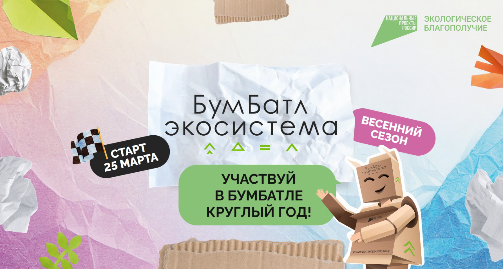 Всероссийская акция по сбору макулатуры «БумБатл» проходит в поддержку национального проекта «Экологическое благополучие». Организаторы проекта: АНО «Национальные приоритеты», Движение «Экосистема» при поддержке Минприроды России. За 5 сезонов «БумБатла» в нем приняли участие 9 млн человек, которые собрали 305 тыс. тонн макулатуры.